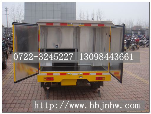 2、廂體分為兩部分:A:運輸炸藥;B:運輸雷管(防爆罐或防爆箱);C:炸藥,雷管同時運輸(廂體必須隔倉,分倉運輸,加裝防爆罐或防爆箱)。廂體為雙層金屬骨架結構,外部為冷扎鋼板,內壁采用鋁合金板蒙面,夾層為隔熱阻燃材料填充。設置對開門,如需安裝抗暴容器則增開側門,側壁設有防雨功能自然通風窗口,以使廂內外空氣流動,廂體內部做防靜電處理,廂體底部與廂內前部鋪有阻燃導靜電膠板,并與底盤等電位連接,通過車輛后端的導靜電裝置與大地相連,可防止靜電火花的產生和車輛靜電及時釋放,提高爆破器材運輸車的安全性。廂體內部前面和側面裝有固定拉環(huán),與捆綁帶使用捆綁貨物以避免移動,保證安全。