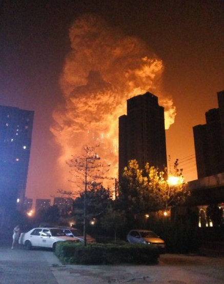 2015年8月12日23:30左右,天津?yàn)I海新區(qū)第五大街與躍進(jìn)路交叉口的一處集裝箱碼頭發(fā)生爆炸,發(fā)生爆炸的是集裝箱內(nèi)的易燃易爆物品?,F(xiàn)場(chǎng)火光沖天,在強(qiáng)烈爆炸聲后,高數(shù)十米的灰白色蘑菇云瞬間騰起。隨后爆炸點(diǎn)上空被火光染紅,現(xiàn)場(chǎng)附近火焰四濺。
