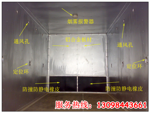 廂體為雙層金屬骨架結構,外部為冷扎鋼板,內壁采用鋁合金板蒙面,夾層為隔熱阻燃材料填充。設置后對開門,開啟角度270°,加裝側門,側壁設有防雨功能自然通風窗口,以使廂內外空氣流動,廂體內部做防靜電處理,廂體底部與廂內前部鋪有阻燃導靜電膠板,并與底盤等電位連接,通過車輛后端的導靜電裝置與大地相連,可防止靜電火花的產生和車輛靜電及時釋放,提高車輛的安全性。廂體內部前面和側面裝有固定拉環(huán),與捆綁帶使用捆綁貨物以避免移動,保證安全。